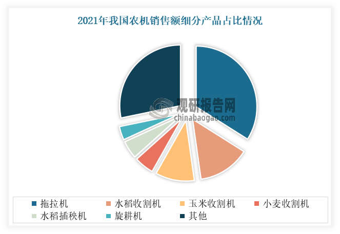此中一曲以来,拖沓机正在我国农业机械市场中占比处于较高地位。以2021年的数据为例,2021年正在农业机械市场中,拖沓机发卖额占比最大,达到33。96%;其次为水稻收割机及玉米收割机,发卖额占比别离为13。82%和10。37%。
