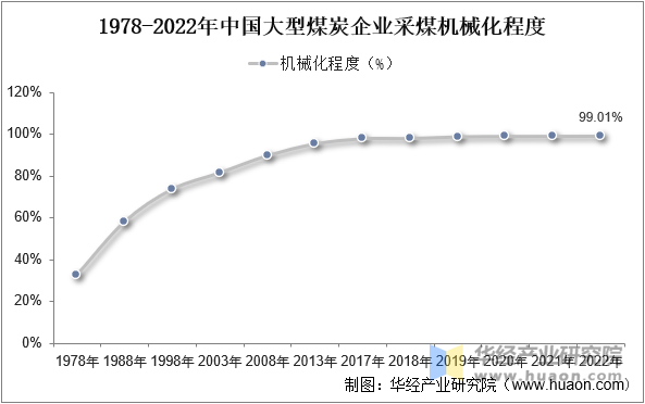 伴跟着煤炭行业的稳健成长,我国煤炭配备制制业加速布局调整和转型升级,财产规模持续扩大,财产集中度较着提拔,先辈高端制制取得新进展,财产根本逐步夯实,产质量量显著提高。据数据显示,我国大型煤炭企业采煤机械化程度由1978年的32。5%提高到2022年的99。01%,已实现高度机械化。跟着行业集中度提拔及煤矿规模的扩大,我国的煤矿开采履历了机械化到从动化的成长,当前正处于智能化起步阶段。