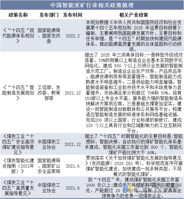 本文节选自华经财产研究院发布的《2023年中国智能采煤行业成长趋向阐发,新手艺的引入成为行业增加的新引擎「图」》,如需获取全文内容,可进入华经谍报网搜刮查看。近年来,《煤矿智能化扶植指南(2021 年版)》和《“十四五”智能制制成长规划》等一系列行业政策,加速推进煤矿智能化转型,激励支撑煤矿企业向智能、平安、绿色标的目的成长,为煤矿无人化智能开采相关营业供给了广漠的市场空间。刊行人以相关政策为导向,努力于无人化智能采煤,推出了以“平安、高效、绿色”为方针的智能开采处理方案,顺应了行业成长趋向,实现了产物优化升级,进一步拓展了成长空间。