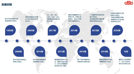 成长过程方面,1992年,新乡市和协科技集团无限公司子公司和协成立;2000年,集团子公司新乡市和协动物药业无限公司成立;2005年,和协饲料机械制制无限公司获得工业产物出产许可证;2012年,集团国际商业核心成立,相关产物走出国门,笼盖美欧非亚30多个国度;2014年,集团取威特公司、明克公司、河南工学院结合,成立了中德饲料机械研究核心;2019年,集团子公司荣获国度级高新手艺企业及专精特新中小企业荣誉称号;颠末30余年行业深耕,现在集团已具有7个子公司,具有员工350余名,已成为畜牧机械制制行业的出名企业。