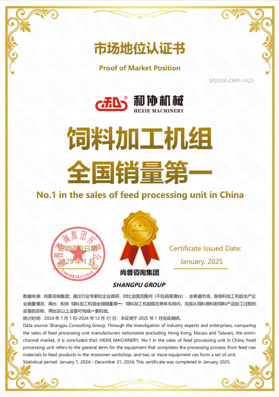 主要支持,正不就义来新的成长机缘取挑和。新乡市和协机械无限公司(以下简称“和协”,曾用名“新乡市和协饲料机械制制无限公司”)凭仗杰出的手艺实力和立异2025年1月,尚普征询集团向和协颁布市场地位认证证书。此次和协荣获尚普征询【和协 饲料加工机组全国销量第一】市场地位认证,标记着和协正在我国饲料加工机组行业中的杰出地位,以及客户对其的高度承认。